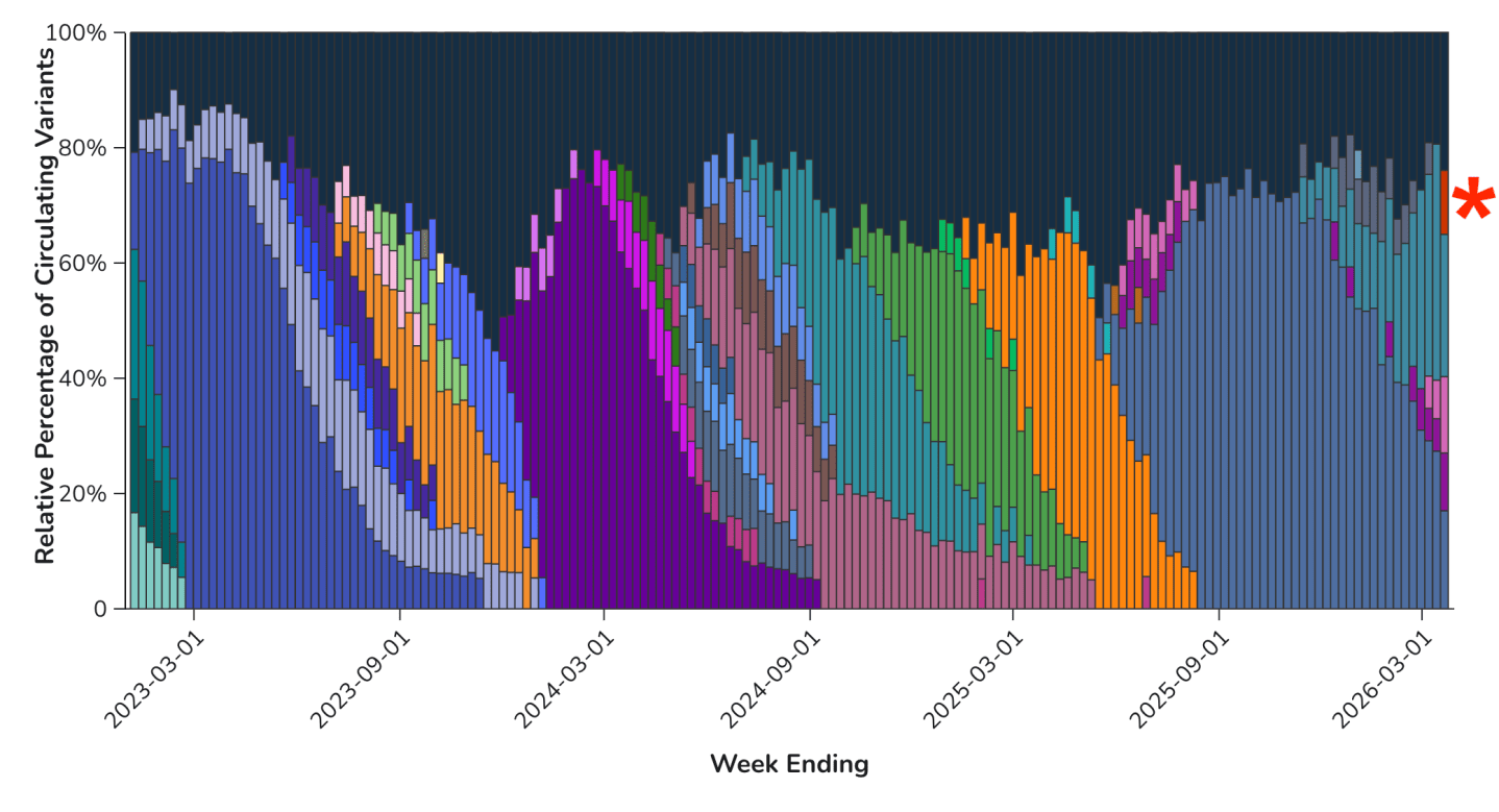 See that tiny block of red data on the far right of this CDC chart, which I have helpfully marked with an asterisk? That’s a new strain of COVID called “Cicada” (officially BA.3.2) which “has a highly mutated genetic sequence that some experts fear could enable it to evade some of our immunity from vaccination or a past COVID infection,” according to Katelyn Jetelina, the respected author of the YLE epidemiology Substack. Although Cicada is spreading fast—23 countries so far—it has not led to a significant wave of new COVID cases…yet.