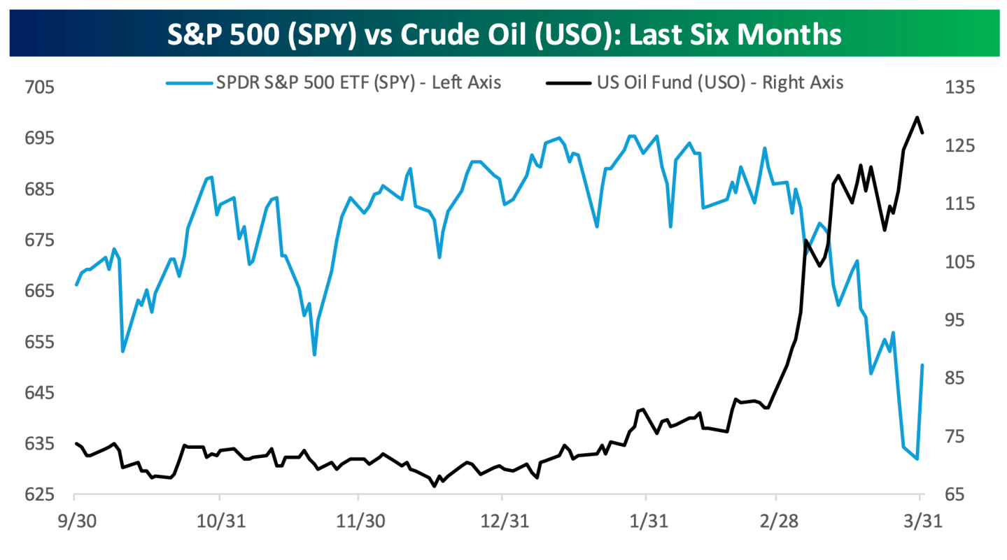 When oil goes up, stocks go down: This chart from Bespoke Investment Group showing the price of oil vs the S&P 500 through Q1 says it all: